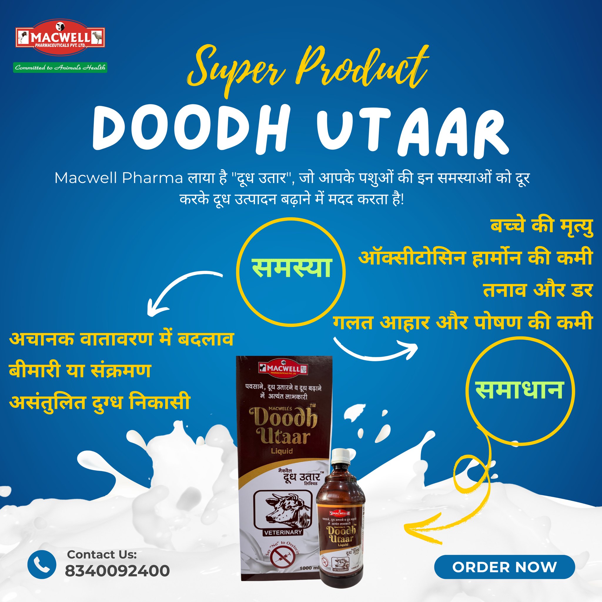 दूध उतार लिक्विड (Doodh Utaar Liquid) पवसाने, दूध उतारने व दूध बढ़ाने में अत्यंत लाभकारी दूध उतार लिक्विड एक विशेष आयुर्वेदिक और पोषक तत्वों का वैज्ञानिक मिश्रण है । अक्सर देखा गया है कि कई गाय व भैंस समय पर थनों में दूध नहीं उतारतीं या पॉसती नहीं हैं, जिससे पशुपालकों को भारी आर्थिक नुकसान उठाना पड़ता है । यह उत्पाद बिना किसी हानिकारक इंजेक्शन के पशु को मानसिक रूप से शांत कर पूरा दूध उतारने में मदद करता है ।